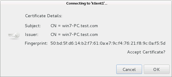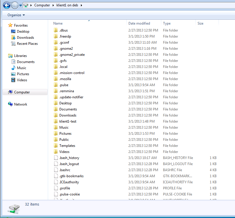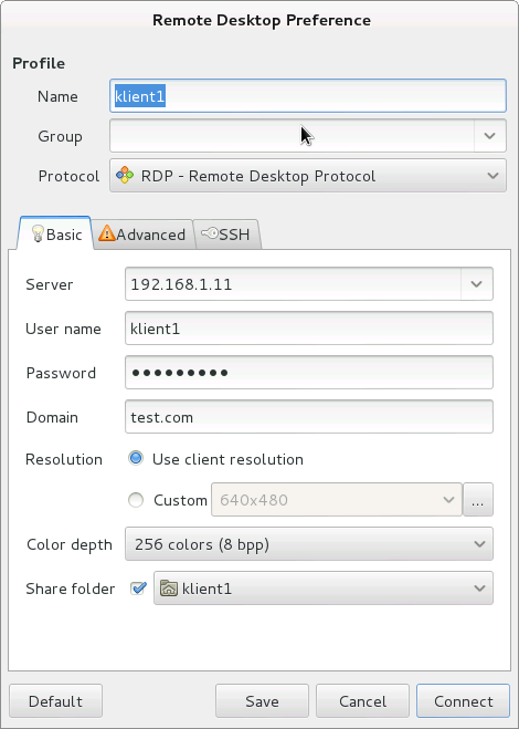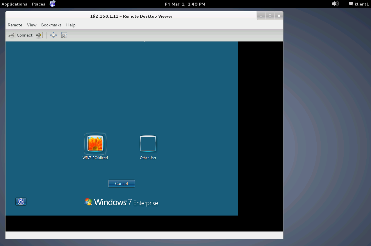 För att ansluta till Active Directory-klienter använder Remmina klientprogram. Jag konfigurera den för att start i fullskärmsläge. Anslutningen sker automatiskt när man loggar in på LTSP klienten. Att logga ut är mindre bekvämt - man måste logga ut från Windows, och sedan från Debian och slutligen stänga av datorn - det krävs fyra musklick.