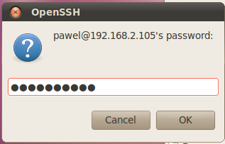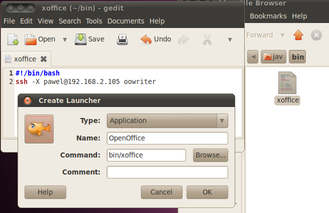 #!/bin/bash ssh -X pawel@192.168.2.105 oowriterPå skrivbordet under HögerMusklick har jag menu - "skapa aktivator" eller motsvarande. Ange namn och path till filen. Man kan välja en fin icon. Efter klick i iconen, anger lösenord till fjärrdatorn och senare kan jag använda programmet på den fjärrdator.