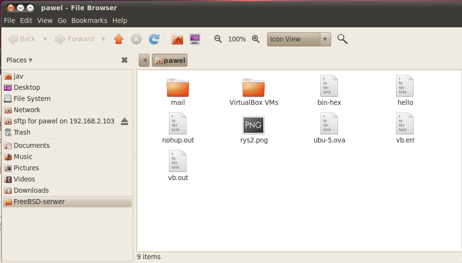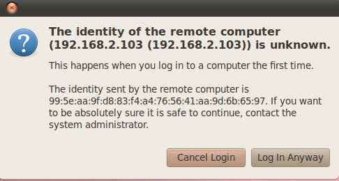 pawel-ubuntu@zeb:~$ ssh paw-5@192.168.2.116 -X The authenticity of host '192.168.2.116 (192.168.2.116)' can't be established. RSA key fingerprint is c6:d0:b8:28:44:2f:fd:52:cd:fe:43:b7:41:d5:0b:2a. Are you sure you want to continue connecting (yes/no)? yes Warning: Permanently added '192.168.2.116' (RSA) to the list of known hosts. paw-5@192.168.2.116's password: Linux ubu-5 2.6.32-33-generic #70-Ubuntu SMP Thu Jul 7 21:09:46 UTC 2011 i686 GNU/Linux Ubuntu 10.04.3 LTS Welcome to Ubuntu! * Documentation: https://help.ubuntu.com/ Last login: Sun Mar 4 11:56:55 2012 /usr/bin/xauth: creating new authority file /home/paw-5/.Xauthority paw-5@ubu-5:~$Nedladdning av ett test bild: