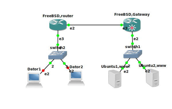 FreeBSD-1 (Gateway) em0 dhcp em1 192.168.0.2 em2 192.168.1.2 Ubuntu1 eth1 192.168.0.10 Ubuntu2 eth1 192.168.0.11 FreeBSD-2 (router) em1 192.168.0.3 em2 192.168.3.2 OpenIndiana dhcp (Dator1) Windows XP dhcp (Dator2)