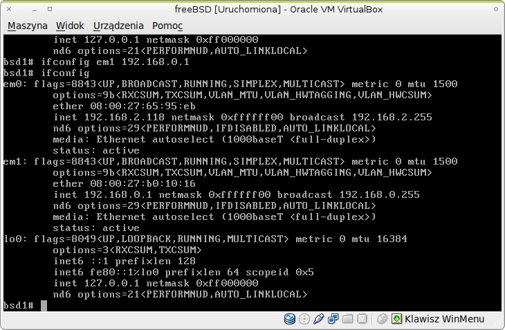 Börjar med FreeBSD. I VB sätter jag ett NIC bridged till min fysiskt interface eth0 - VM ska synas som en riktigt dator i min fysiskt LAN och ta IP inställningar från DHCP server på min router. Systemet är en Gateway - all kommunikation med Internet ska gå genom det. Den interface är under VB kontroll. De andra interface ska ha statiskt IP-adress som gäller i DMZ. Unix/Linux kernels innehåller effekivt routing men jag  för NAT och firewall väljer IPFILTER - samma som i jail - kapitel om operativsystem-nivå virtualisering.