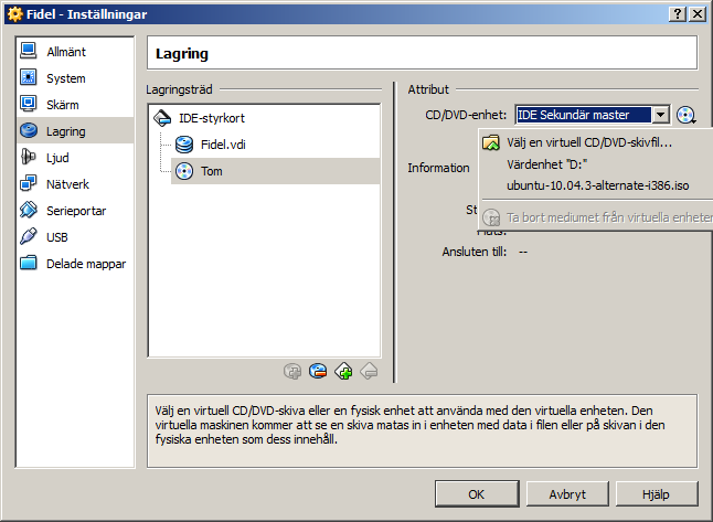 Väljer "D" för fysiskt CDROM med installations skiva.